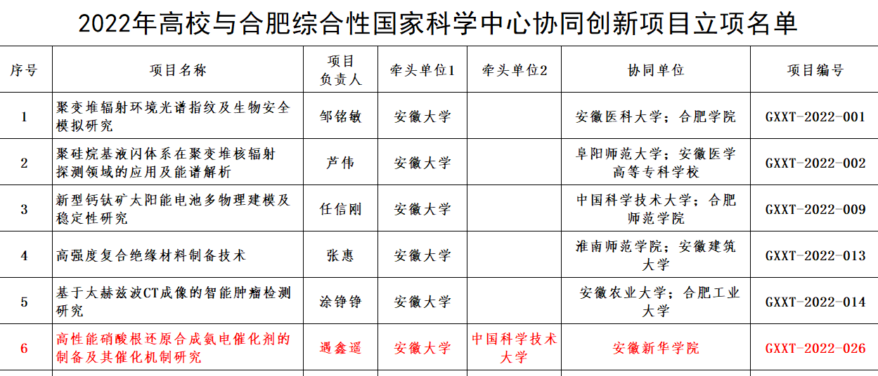 本网讯(通讯员:赵影)11月28日,安徽省教育厅发布了《安徽省教育厅关于下达2022年安徽省高校协同创新项目的通知》,bat365药学院赵颖博士协同申报的课题《高性能硝酸根还原合成氨电催化剂的制备及其催化机制研究》获得立项批准。该项目是由安徽大学和中国科学技术大学牵头申报,bat365为协同合作单位,项目实施周期为2-3年。
