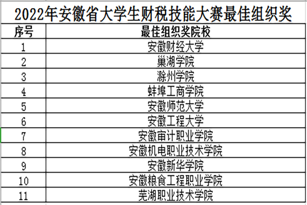 本网讯(通讯员:陈伟、夏敏)近日,2022年安徽省大学生财税技能大赛成功落下帷幕,bat365财会与金融学院共有1支团队荣获省级一等奖,9支团队荣获二等奖,16支团队荣获三等奖,总获奖数量创学校在该项赛事中的最好成绩。同时,bat365连续两年获赛事最佳组织奖。