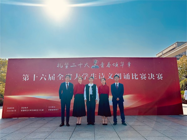本网讯(通讯员:冯子恒)4月1日,由安徽省教育厅主办,安徽师范大学和安徽省朗诵艺术学会承办的第十六届全省大学生诗文朗诵比赛决赛,在安徽师范大学花津校区大礼堂举行。由翟春翔、方晓晴老师指导的朱观枫、王佳依同学朗诵的作品《鲁迅墓前思》获专业组二等奖。由洪玉、翟春翔老师指导的余莹、何恩光、刘娜娜、周少君同学朗诵的作品《读中国》获非专业组三等奖。