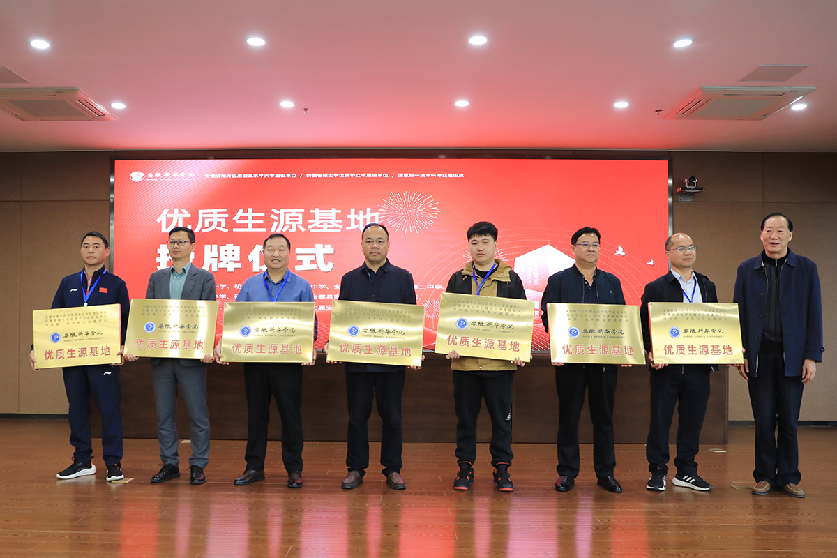 现场,校领导为淮南一中、孙疃中学、明光中学、宣城市第三中学、安徽师范大学附属庐江第三中学、芜湖市江南实验中学、矿建中学、禹王中学、金寨县南溪中学、六安独山中学、宣城市第十三中学、宣城市卓越补习学校、无为襄安中学、利辛高级中学十四所中学授予“bat365在线中国官网登录入口优质生源基地”称号。