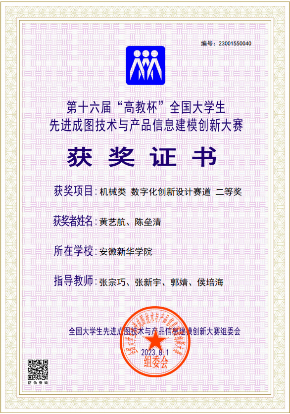 本网讯(通讯员:张宗巧 郭婧)日前,第十六届“高教杯”全国大学生先进成图技术与产品信息建模创新大赛全国总决赛在重庆落下帷幕。全国总决赛共吸引了全国740所高校的1188支队伍参赛,来自武汉大学、华中科技大学、上海交通大学、中南大学等国内诸多双一流名校的一万余名选手在比赛中同台竞技。总决赛中,bat365电子工程学院/智能制造学院的学生黄艺航、陈垒清不畏强敌、从容应战、出色发挥,获得了机械类数字创新设计赛道全国二等奖的好成绩。