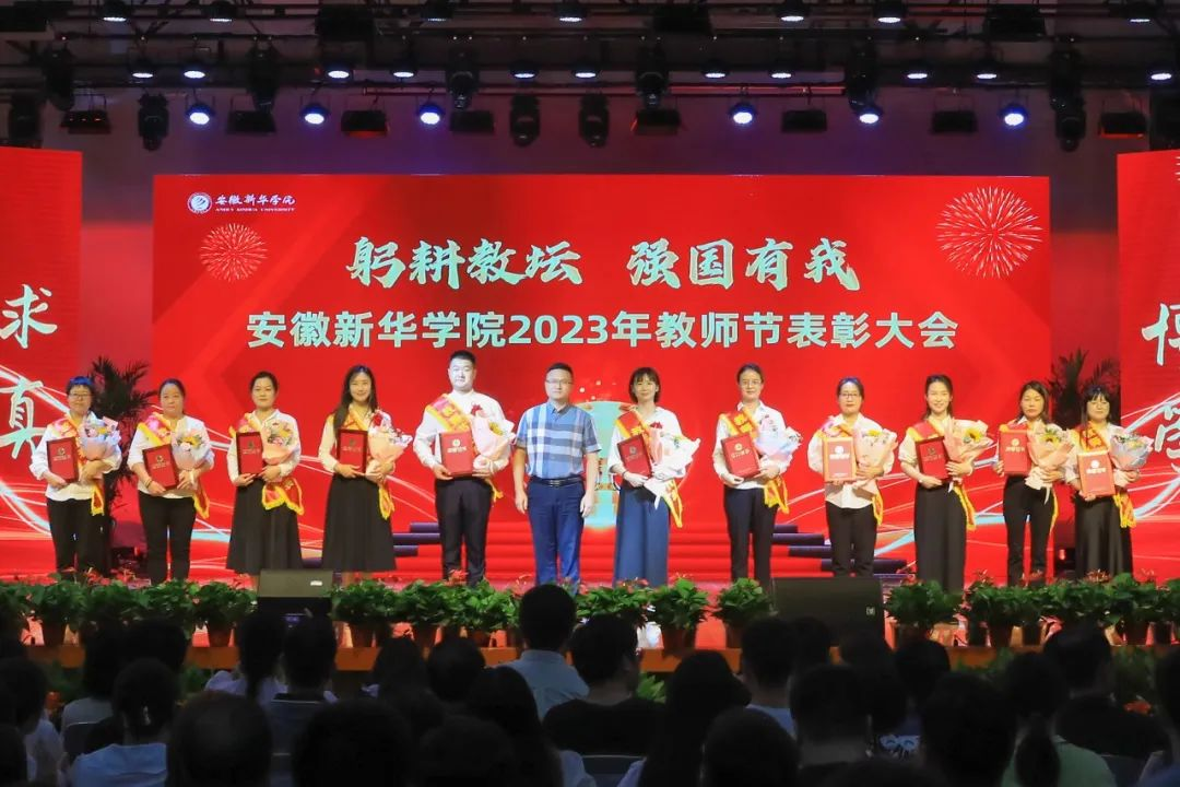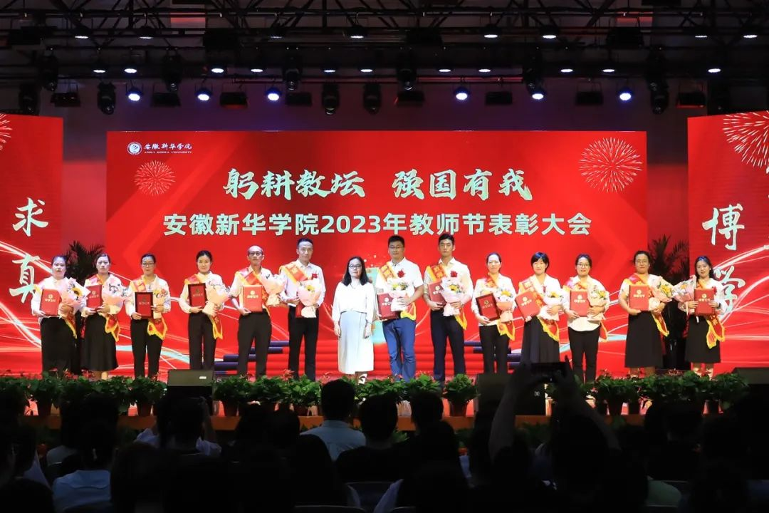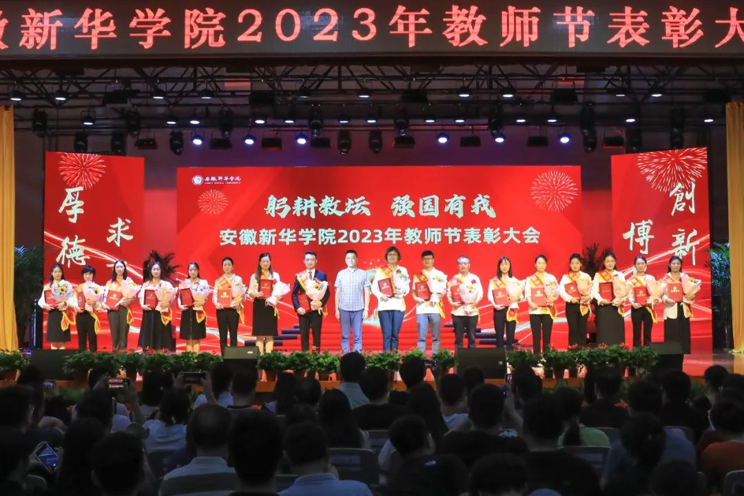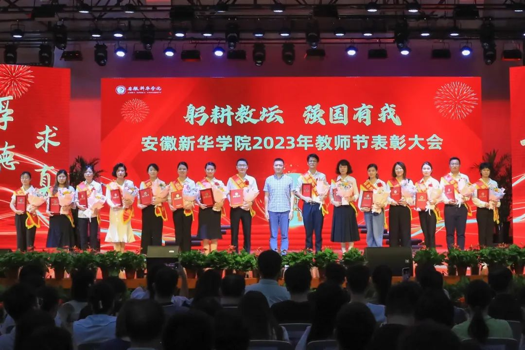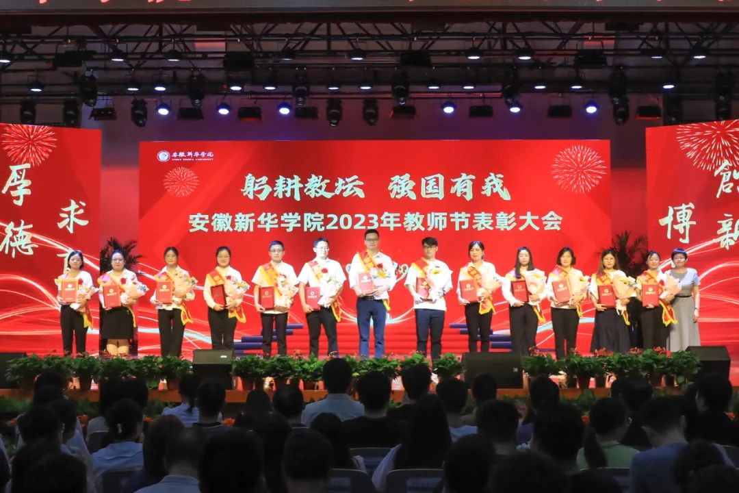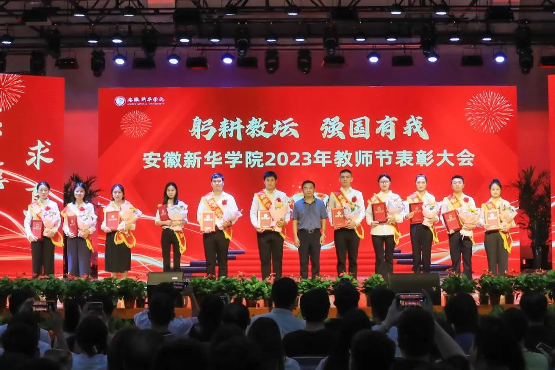 第二篇章表彰了校级“最美辅导员”、2022年度安徽省“最美高校辅导员”、2023年度省级“心理干预先进个人”“服务之星”“华园新星”、校级“师德先进个人”、校级“先进教育工作者”、校级“教书育人楷模”、校级“科研标兵”。学生代表为获奖教师送上鲜花,校领导为获奖老师颁奖,送上节日的祝福。