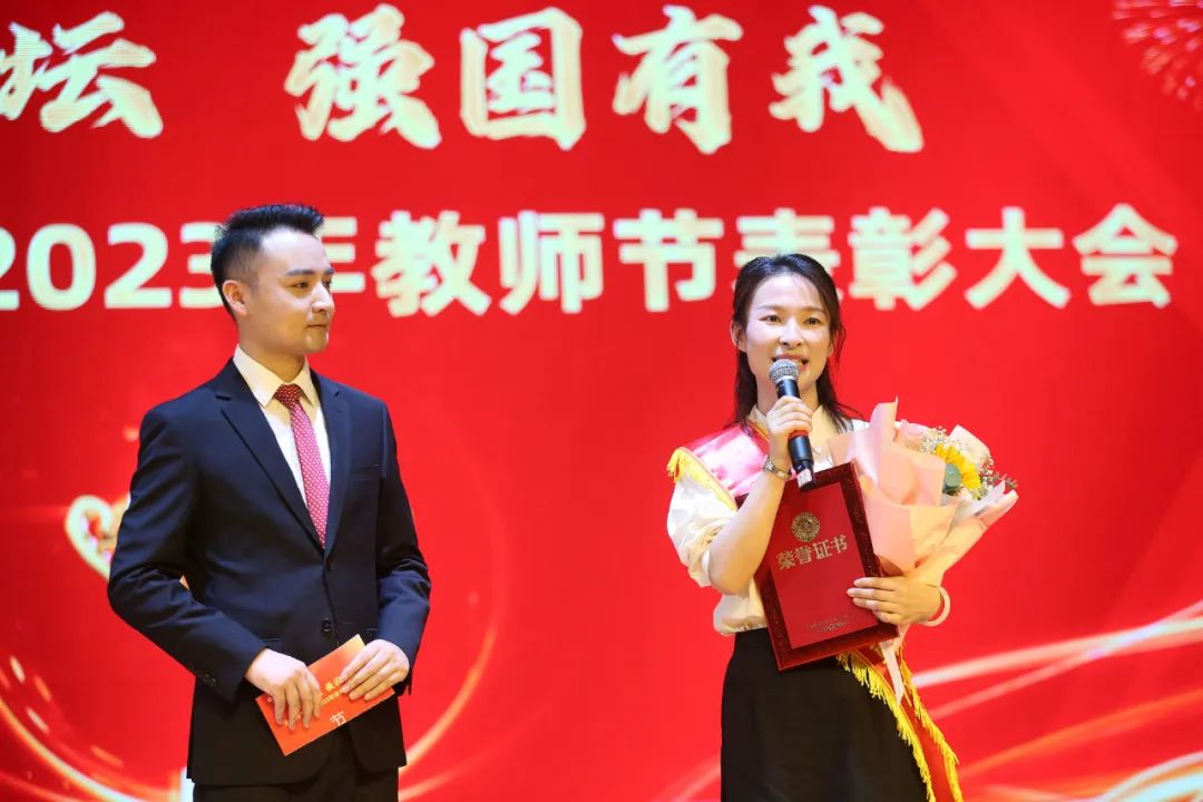 第一篇章表彰了“学科与科技竞赛优秀指导教师”“艺体类国家奖项优秀指导教师”、省级以上“教学竞赛优秀教师”。学生代表为获奖教师送上鲜花,校领导为获奖老师颁奖,送上节日的祝福。