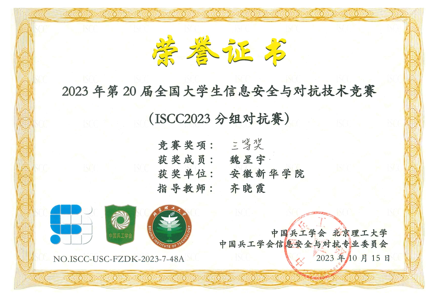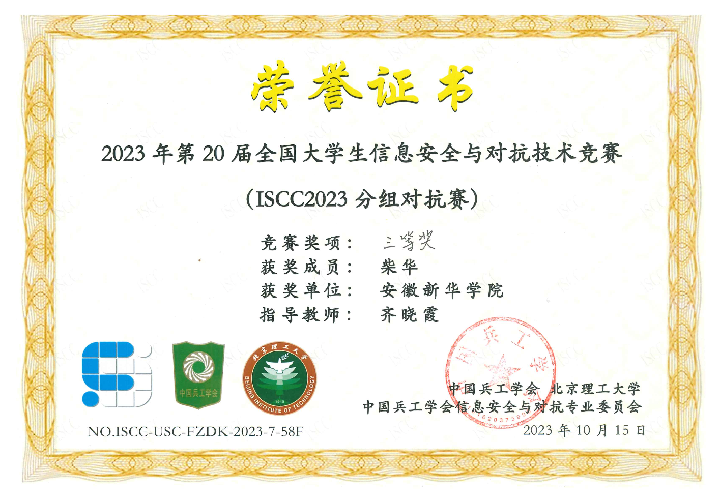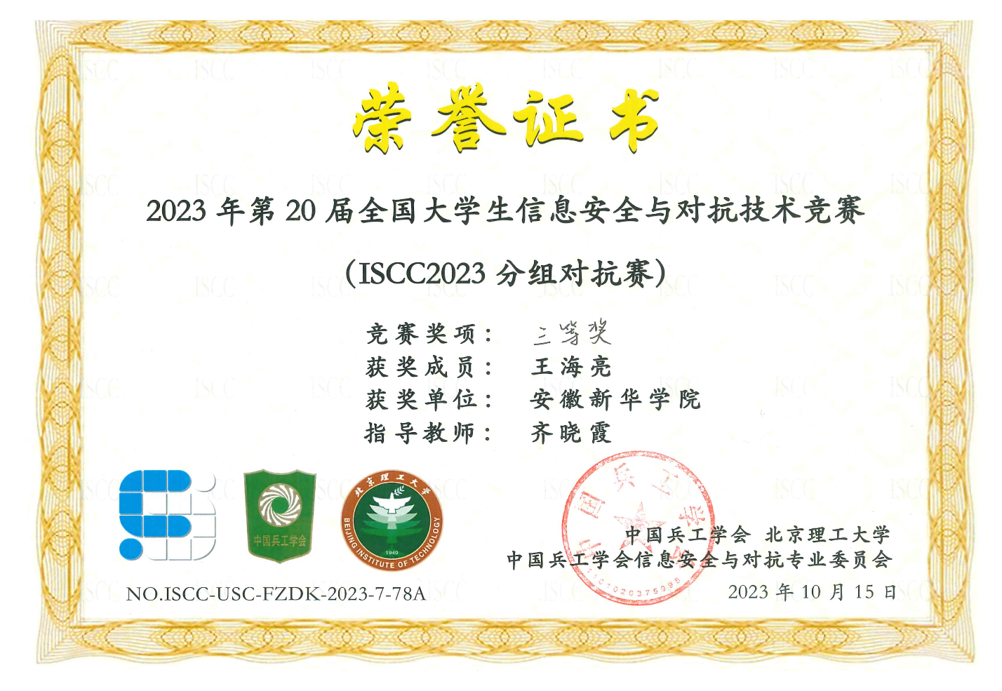 喜报!bat365学子在第20届全国大学生信息安全与对抗技术竞赛(ISCC2023)中喜获佳绩