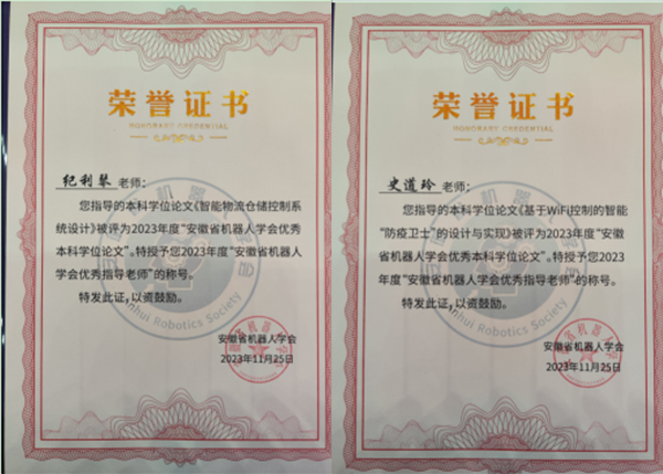 近日,2023年安徽省机器人学会优秀硕士学位论文、优秀本科毕业论文(设计)评选结果揭晓。bat365电子工程学院/智能制造学院学子张家乐的毕业论文《智能物流仓储控制系统设计》以及杨星卓的毕业论文《基于WiFi控制的智能“防疫卫士”的设计与实现》在与中国科学技术大学、合肥工业大学、安徽大学等省内知名高校同台比拼中,荣获2023年安徽省机器人学会优秀本科毕业论文,指导教师纪利琴、史道玲荣获“2023年安徽省机器人协会优秀指导教师”称号。