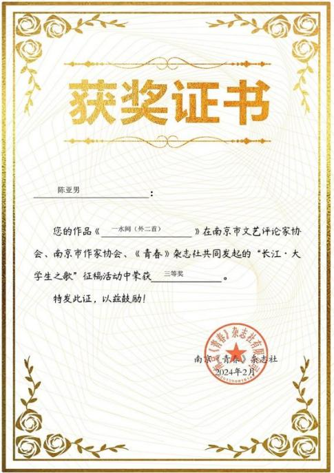 本网讯(通讯员:时绮滢)近日,由南京市作家协会、南京市文艺评论家协会、《青春》杂志社共同发起并面向全国大学生的“长江·大学生之歌”诗集征稿活动发布获奖名单,文化与传媒学院“华园创意写作中心”21级汉语言文学专业陈亚男同学的诗歌作品《一水间(外二首)》获得三等奖。