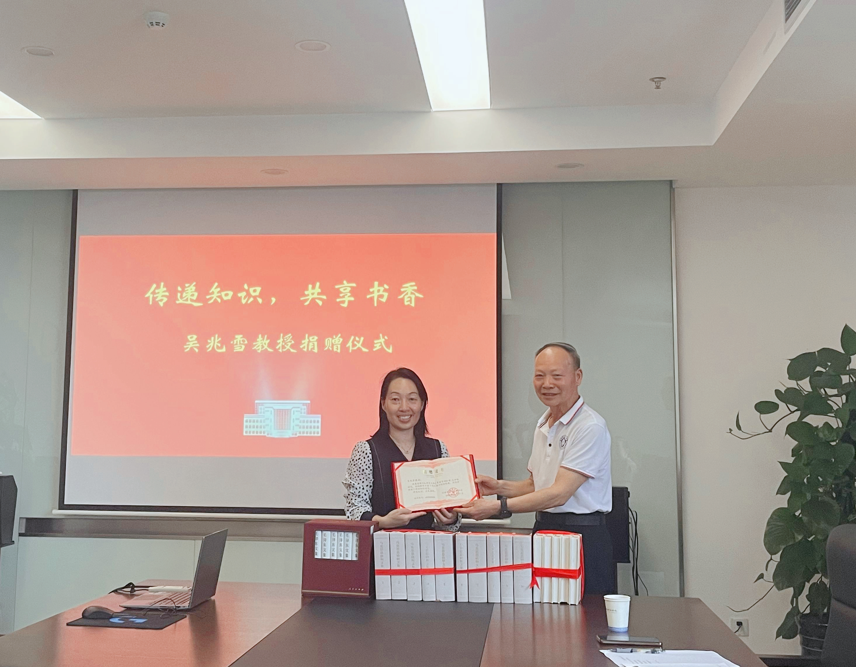 吴教授表示:“这些书陪伴了我大半生,如今我希望它们能找到更好的归宿,继续发挥作用,为年轻学者提供帮助,为学术发展贡献一份力量。”随后,图书馆副馆长汤干君接收了吴教授的赠书。