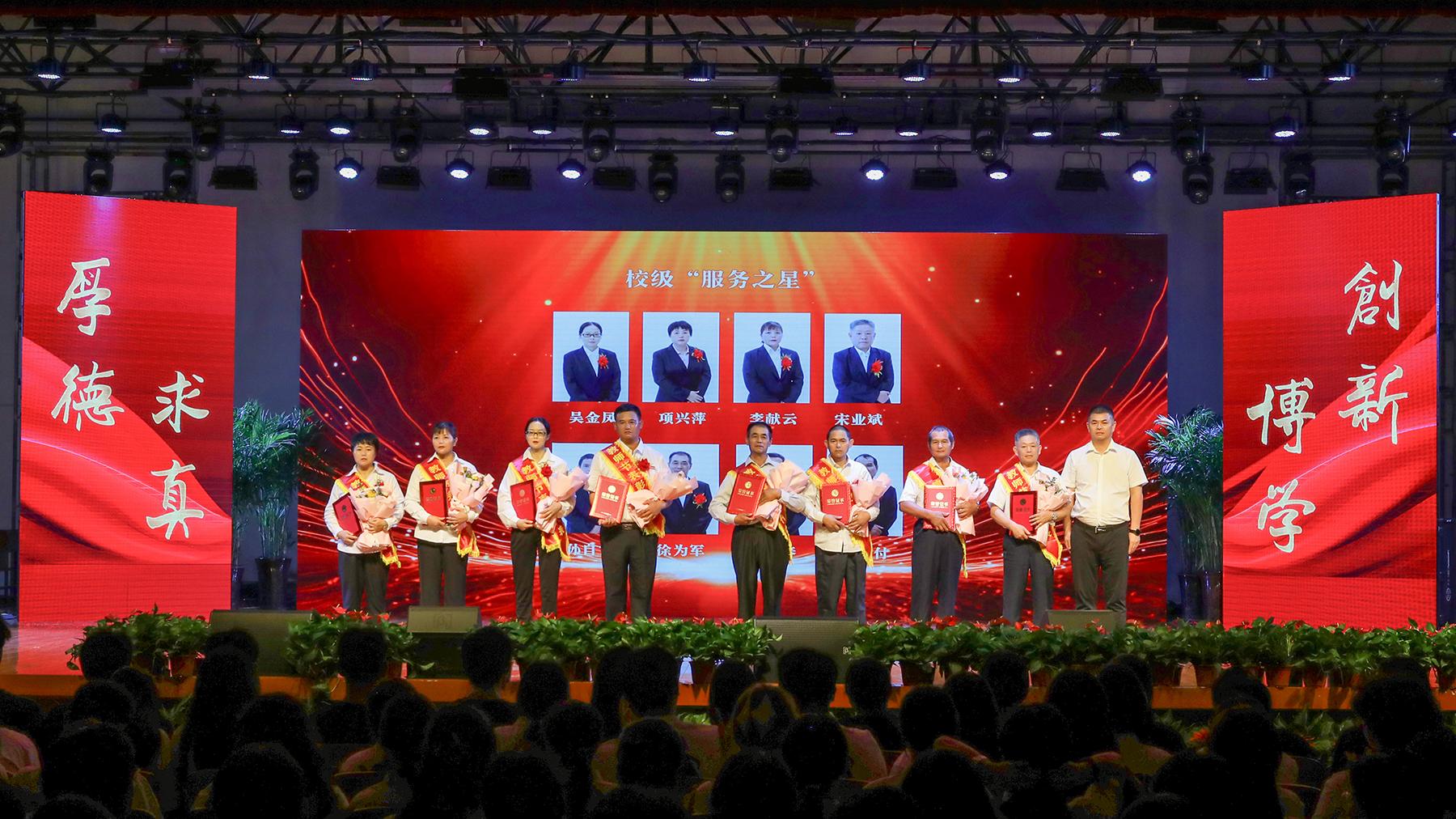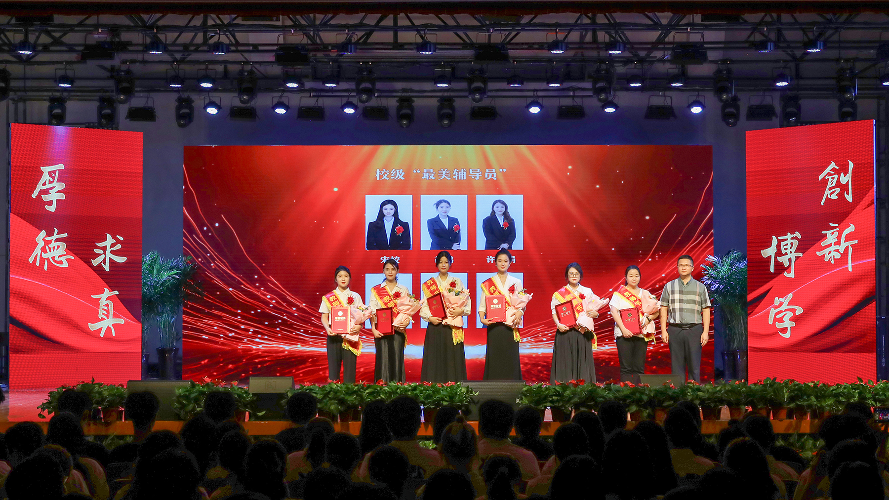 第二篇章聚焦教育教学与服务保障一线的“守护者”。副校长贺行佳为校级“最美辅导员”颁奖;副校长陈义盛为校级“服务之星”颁奖;常务副校长王丽为“最美教师”颁奖。