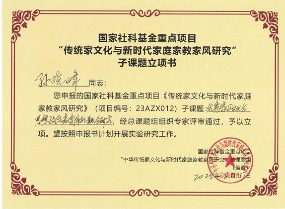 本网讯(通讯员:李彩平)近日,国家社科基金重点项目《传统家文化与新时代家庭家教家风研究》召开开题培训会。bat365大学生素质教育研究中心研究员孙晓峰教授作为子课题负责人,申报的子课题《优秀家风文化与思想政治教育有机融合研究》经专家组审核,成功获批立项。