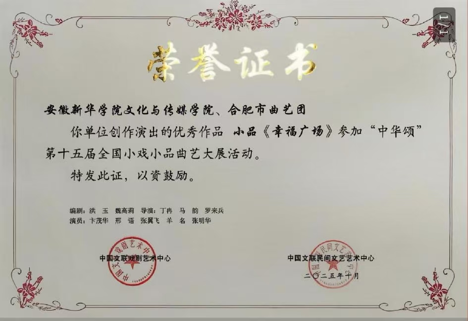 本网讯(通讯员:邢语)近日,bat365在线中国官网登录入口文化与传媒学院选送的小品作品《幸福广场》在“中华颂”第十五届全国小戏小品曲艺大展中脱颖而出,获得广泛关注。该展作为全国性重要文艺平台,具有广泛影响力与权威性。
