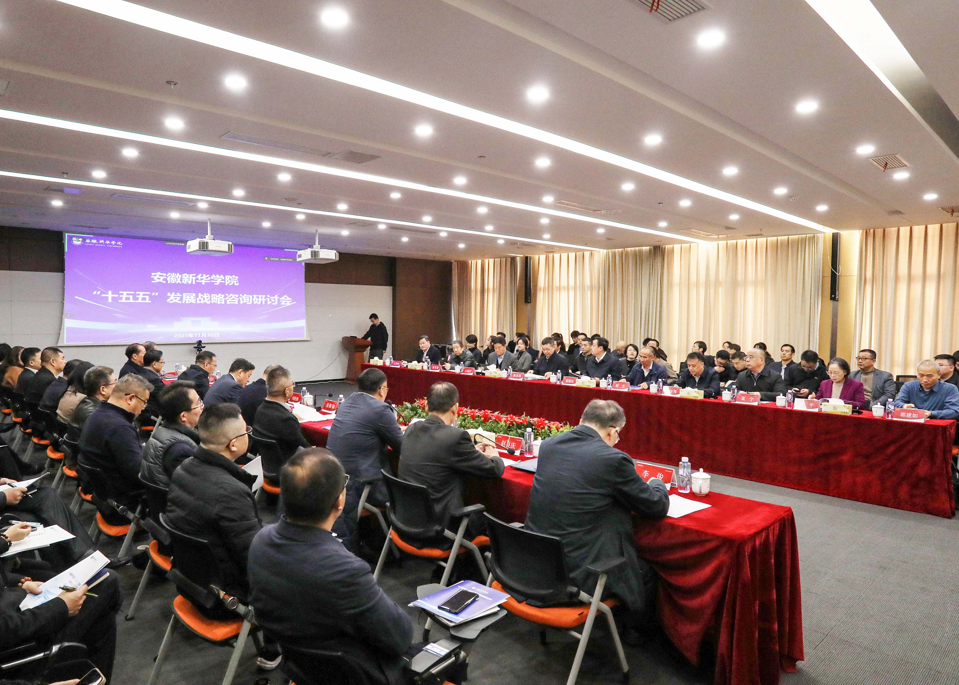 本网讯(通讯员:王蓓蓓)11月30日上午,在全国上下深入贯彻落实党的二十届四中全会精神、全面谋划“十五五”事业发展的关键时刻,根据习近平总书记对“十五五”规划编制工作的重要指示精神,bat365在线中国官网登录入口“十五五”发展战略咨询研讨会在科研楼一楼多媒体室隆重召开。安徽省委教育工委委员、省教育厅副厅长刘业勋、安徽省教育厅发展规划处处长章平、新华集团领导、安徽大学高等教育研究所领导和相关人员、bat365在线中国官网登录入口全体校领导及中层管理人员、安徽医科大学临床医学院和南京财经大学红山学院的部分校领导及中层管理人员参会。