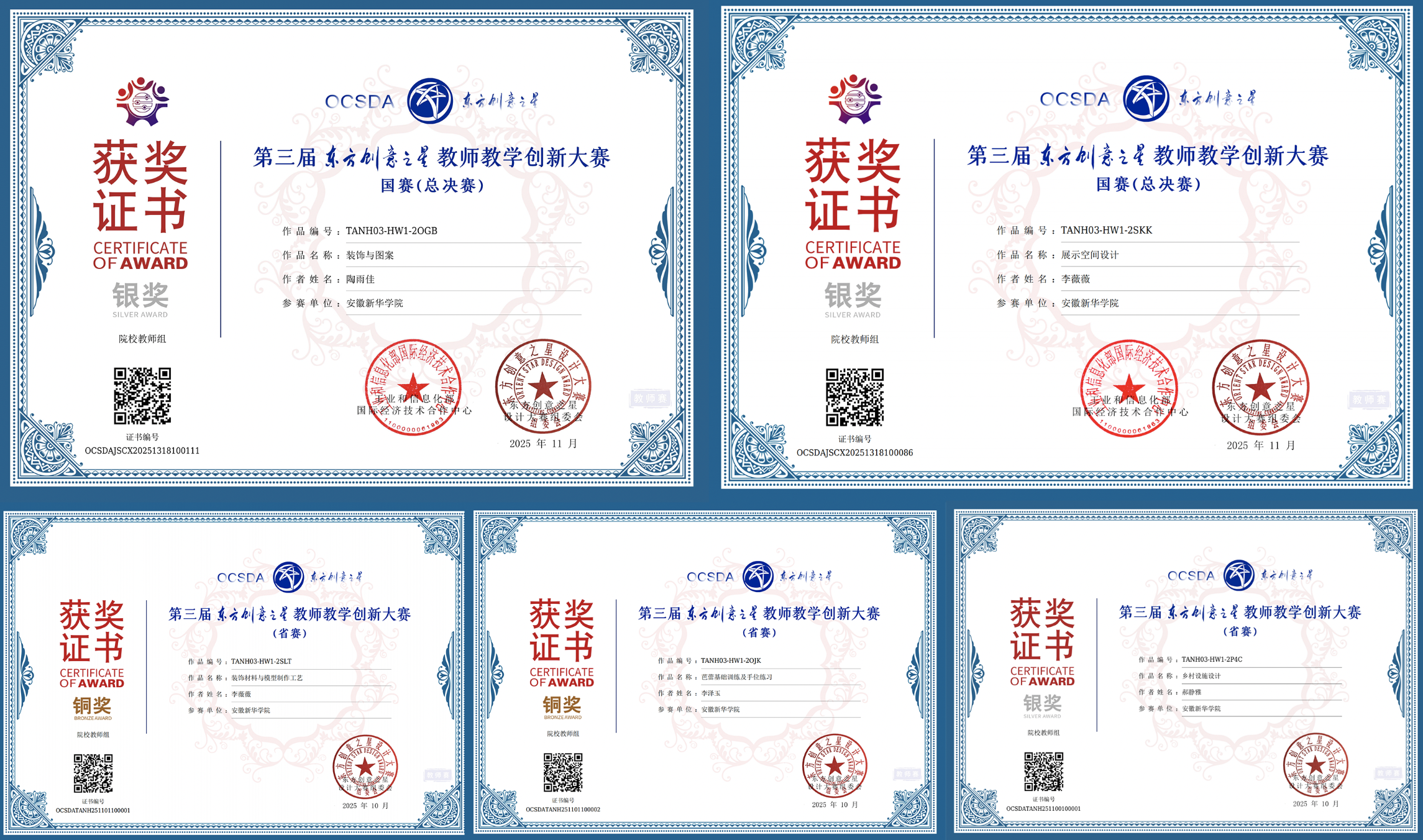 此外,在兼具艺术性与商业价值的第三届东方创意之星教师教学创新大赛中,我院教师团队表现出色,共获国赛银奖两项,省赛银奖1项、铜奖2项。该大赛强调设计创新与产业需求的结合,获奖作品不仅展现了高超的艺术水准,更体现了教学设计中蕴含的深厚市场洞察与人文关怀。