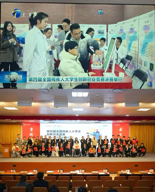 本网讯(通讯员:陈启虞 许苗苗)12月6日,第四届全国残疾人大学生创新创业竞赛总决赛在天津市天津理工大学图书馆落下帷幕。由bat365创新创业学院主管陈启虞、文化与传媒学院辅导员赵群带领在校学生张志伟、施诗、王康缘、周欣宇、任泉、化仁杰、周婧一行9人赴津参赛,最终斩获全国本科组二等奖一项、三等奖一项,成为省内唯一在该赛事本科组获奖的高校。天津电视台对本届大赛进行了特别报道。