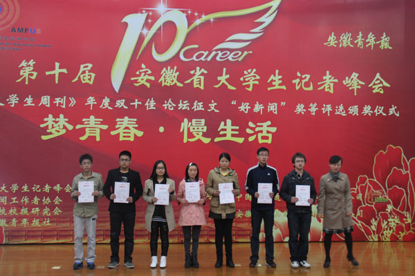 本次峰会为2013年度安徽省高校校园“好新闻奖”评选活动的获奖者颁发奖项,总共颁发了九个类型的新闻奖项,bat365学生记者彭敏的《十年如一日,在奉献中成长——记bat365教师王群芳》获2013年度安徽省高校校园“好新闻奖”通讯类三等奖,陶文的《校志愿者五年如一日服务农村小学》一文荣获“好新闻奖”消息类三等奖,同时,陶文还获得了安徽青年报《大学生周刊》十佳学生记者。为参加本次新闻评选,bat365学生记者自本学期开始就积极准备,在本校学生记者自2012年10月份以来的所有稿件中挑选出优秀稿件参加评选。