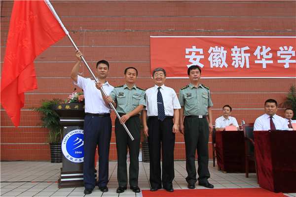 校党委书记、督导专员胡昭林和中国人民解放军陆军军官学院研究生管理大队副大队长陈勇上校向军训团授旗,军训团团长韩永勇、政委汪俊东接旗并合影留念。