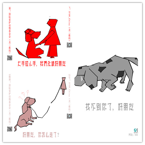 付莉同学的公益广告设计作品“朋友在哪里?”以国际爱护动物基金会的“伴侣动物-关爱流浪动物”为主体,用简单的线条进行组合,构成符合形式美法则的整体,创意手法简洁鲜明,很好的展现了广告创意,也契合了主题。