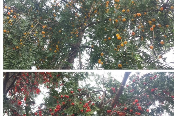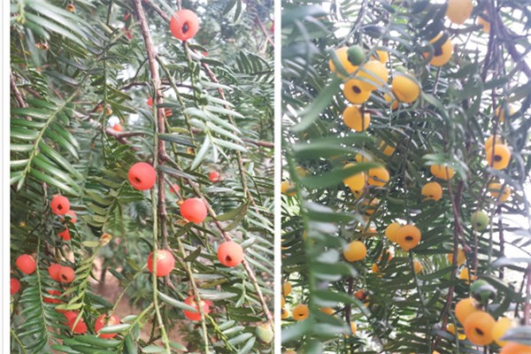 宣州区基地有二万多棵红豆杉,被考察的两株变异豆杉高4.5米,胸径11厘米,树龄16年,其植株外形与红豆杉区别不大,只其树叶较红豆杉树叶宽大,树干表面更为光滑,与红豆杉外观比较见图1。据介绍,前些年一直没有发现树上结有这种黄色果实,此次工作人员巡查时,意外发现其中一株挂满了玲珑剔透的黄色果实,与红豆杉果实明显不一样,疑似黄豆杉,有近200粒。