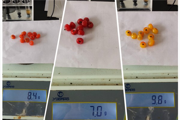 两株变异豆杉中一株果实为鲜黄色,另一株为橘黄色,果实色泽鲜艳,比红豆杉果实大,果肉更饱满,平均每颗比红豆杉果实重0.14-0.28g,其果籽比红豆杉果籽颜色浅,个大且圆润,三种果实和果籽见图2。