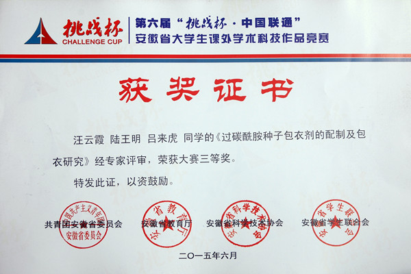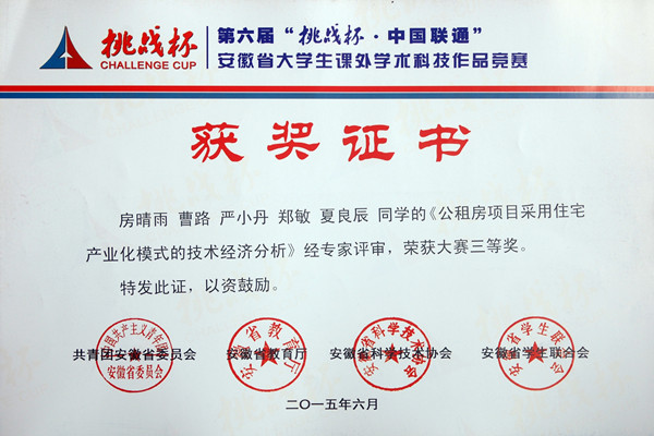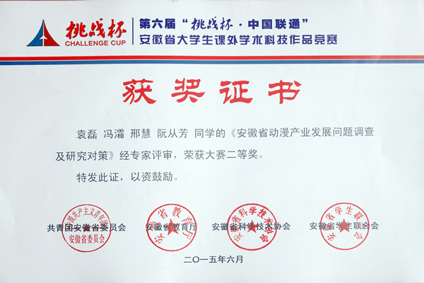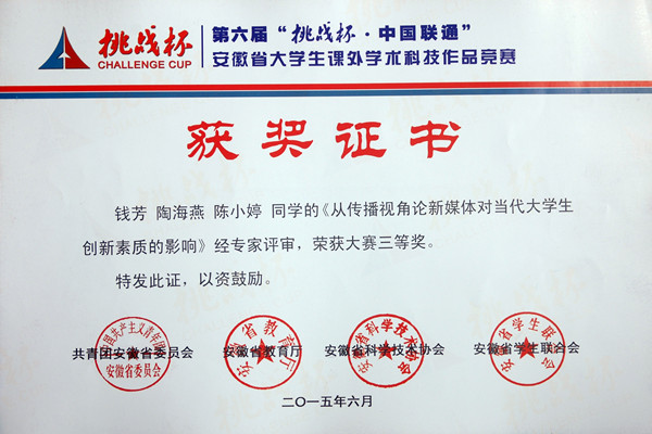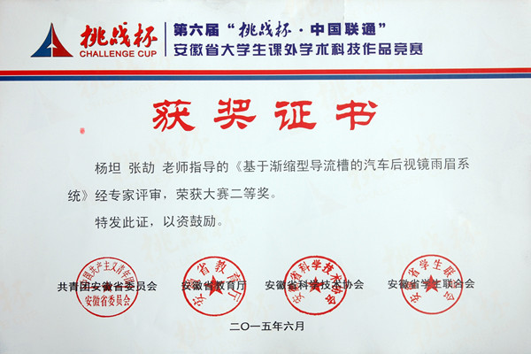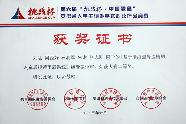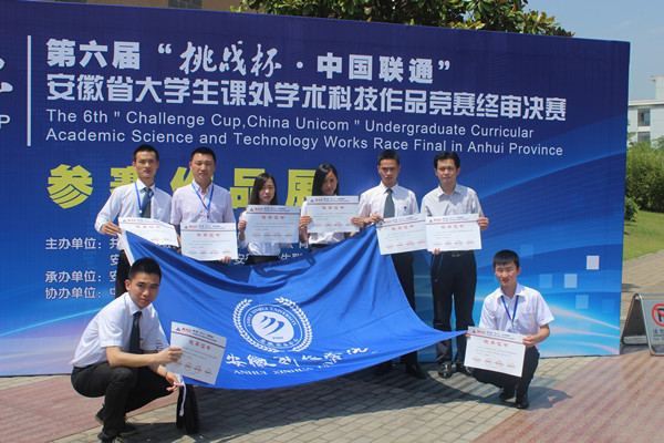 本网讯(通讯员:吕翔)6月4日至6日,由共青团安徽省委员会、安徽省教育厅、安徽科学技术协会、安徽省学生联合会共同主办的第六届“挑战杯”安徽省大学生课外学术科技作品竞赛终审决赛在安徽大学举行,经过激烈角逐,动漫学院袁磊、冯灀、邢慧、阮从芳四位同学的作品《安徽省动漫产业发展问题调查及研究对策》,土木与环境工程学院刘斌、周西好、石利军、朱琳、张志刚五位同学的作品《基于渐缩型导流槽的汽车后视镜雨眉系统》荣获二等奖;商学院张玉倩、丁梦爽、陈皖皖三位同学的作品《应用型高校大学生兼职调查报告——基于应用型人才的培养》,土木与环境工程学院房晴雨、曹路、严小丹、郑敏、夏良辰五位同学的作品《公租房项目采用住宅产业化模式的技术经济分析》,文化与新闻传播学院钱芳、陶海燕、陈小婷三位同学的作品《从传播视角论新媒体对当代大学生创新素质的影响》,药学院汪云霞、陆王明、吕来虎三位同学的作品《过碳酰胺种子包衣剂的配制及包衣研究》获得三等奖。本次大赛获奖的数量和级别均创历史最好成绩。