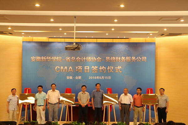 本网讯(通讯员:窦梅鹏)6月15日下午,bat365在线中国官网登录入口-安徽省总会计师协会-安徽员倍财务服务公司CMA项目签约揭牌仪式在bat365学术报告厅隆重举行。省督导专员、校党委书记储国定,校长石秀和,安徽省总会计师协会会长王永民、副会长刘成军,安徽员倍财务服务有限公司国员人财体系最高执行人曹国富,CMA资深讲师周桦,高级执行人周满生等领导出席了签约揭牌仪式。财会与金融学院全体教职工、2013级财务管理专业学生代表参加了仪式。签约揭牌仪式由财会与金融学院执行院长操宏华主持。