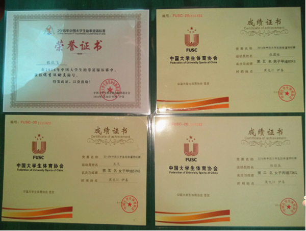 据悉,本次比赛由中国大学生体育协会主办,黑龙江省伊春市教育局、体育局承办。比赛历时7天,共有来自全国118所高校的906名运动员参赛,bat365代表队派张国栋、杭讯飞、李涛、王芃、陈丽朵五名队员参赛。张国栋、王芃两位同学顽强拼搏,最终分别获得男子甲组80KG级第五名、甲组女子57KG级第五名的好成绩。陈丽朵在女丙73KG的比赛中表现突出,第一轮比赛中轻松获胜,在第二轮半决赛上发挥出色,连续进攻,以14:8大比分挺进决赛,最终荣获亚军。