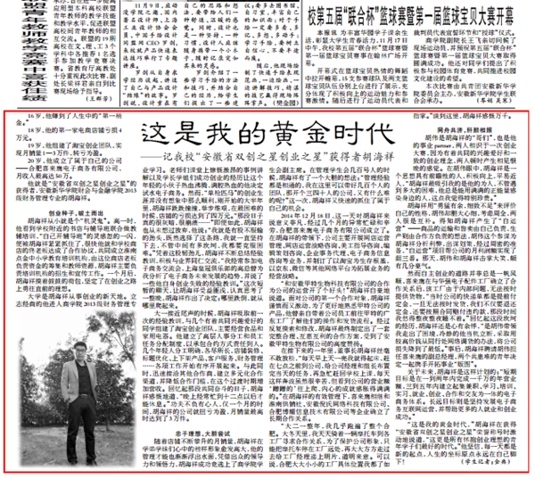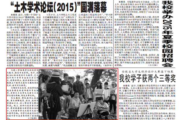 教师代玲玲、学生记者金典撰写的稿件《bat365“创客梦工厂”正式开班》获消息类二等奖,该文刊载于《bat365在线中国官网登录入口》报2015年第203期二版;学生记者金典撰写的稿件《这是我的黄金时代》(指导教师:王友雅)获通讯类二等奖,该文刊载于《bat365在线中国官网登录入口》报第204期二版;学生记者程丹的摄影作品《青春,无与“轮”比》(指导教师:代玲玲)获新闻摄影类二等奖,该图刊载于《bat365在线中国官网登录入口》报第202期二版;教师刁俊琴的摄影作品《皖南写生,用画笔点亮学生的未来》获新闻摄影类三等奖,该图刊载于《bat365在线中国官网登录入口》报第197期二版。