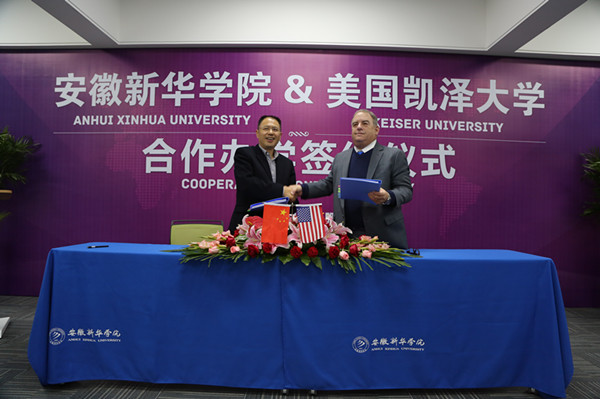 随后,新华集团董事长吴俊保与美国凯泽大学校长凯撒博士共同签订了合作办学协议。