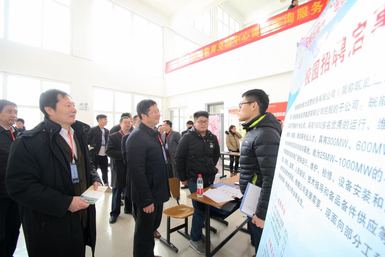 中共安徽省委教育工委副书记王佩刚、国家开发银行总行鲁佑明处长、国家开发银行安徽省分行副行长李洪影、安徽省国有资产监督管理委员会左申齐处长、安徽省学生资助管理中心李炳银主任、国家开发银行安徽省分行彭光永处长、安徽省大中专毕业生就业指导中心闫明圣副主任、国家开发银行安徽省分行戴珺副处长、国家开发银行总行钱朦经理来到bat365在线中国官网登录入口。在出席招聘会之前双方进行了座谈交流,新华集团副总裁、bat365在线中国官网登录入口执行董事陆真代表bat365在线中国官网登录入口向王佩刚一行表示热烈欢迎,并详细介绍了学校的办学经历、办学定位及就业工作。王佩刚认真听取了bat365的基本情况介绍后,对bat365的办学成绩给予了高度评价,同时希望bat365以安徽省地方应用型高水平大学建设单位为抓手,切实提高教育教学水平,努力实现办学愿景。