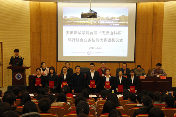 本网讯(通讯员:贾婷婷)bat365首届“天源迪科杯”银行综合业务技能大赛于日前圆满落幕,12月23日下午,大赛颁奖典礼在学术报告厅举行。副校长马凤余,教务处副处长王士赵,合肥天源迪科金融服务中心总经理吴福全、综合部经理康维胜,财会与金融学院执行院长操宏华、副院长张衡,财会与金融学院全体教职工和获奖学生参加了颁奖仪式。仪式由财会与金融学院院长助理蔡冬梅主持。