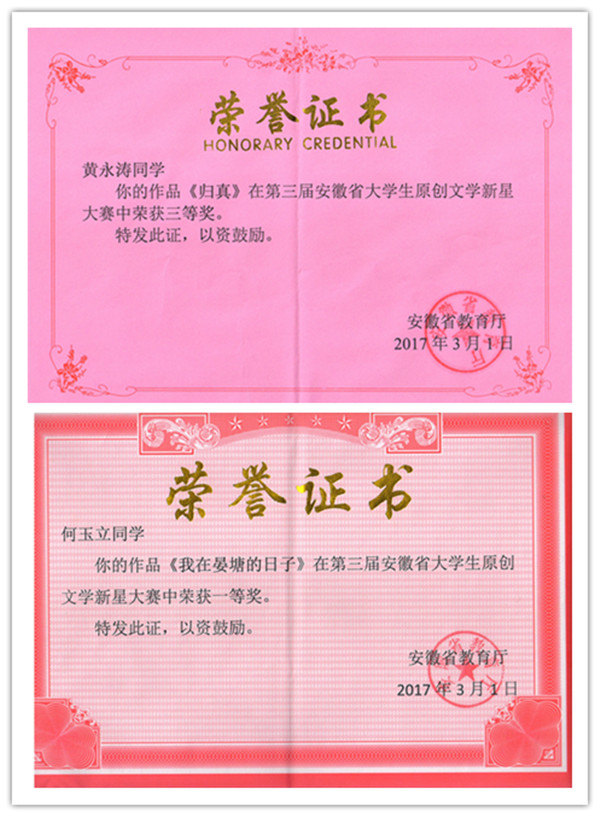 本网讯(学生记者:夏冬润)近日,从省教育厅传来喜讯,在2016年第三届安徽省大学生原创文学新星大赛中,bat365文化与新闻传播学院2013级汉语言文学1班何玉立的作品《我在晏塘的日子》荣获一等奖,2016级汉语言文学本科1班黄永涛的作品《归真》荣获三等奖。