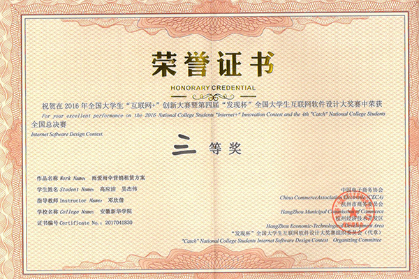 第四届发现杯自2016年10月正式启动,历时3个月,吸引全国31个省份(除港澳台),524所高校、来自108个专业的3141个团队报名参赛。大赛分设“APP 开发与设计”和“网络营销技能”两个赛项,每个赛项分设本科组(含本科以上)和高职组。共分为东北、华北、华东、华南、华中、西部六大赛区。经过区域赛的评审,《雨爱雨伞营销租赁方案》获得网络营销技能本科组华东赛区二等奖,同时进入全国总决赛。在总决赛终审答辩过程中,“突破口”团队凭借雨伞共享的创意和突出的表现获得总决赛三等奖。