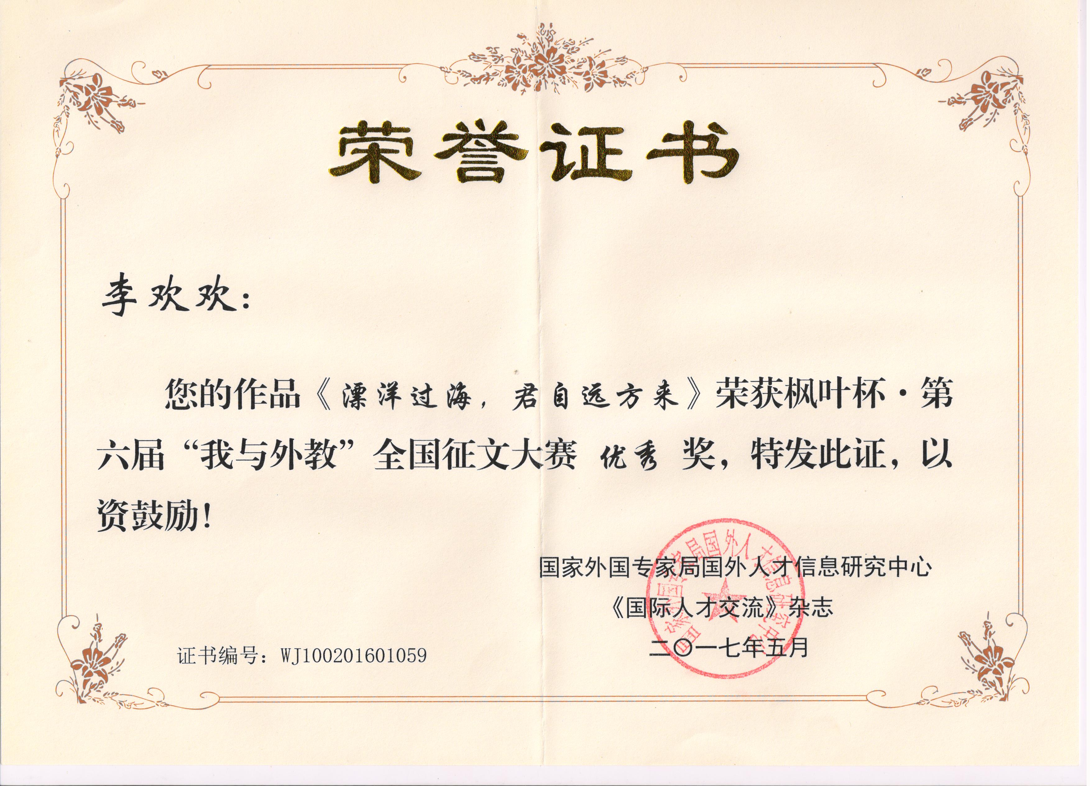 本网讯(通讯员:马兰、周晶 )5月13日,由国家外国专家局主办的“枫叶杯”2016“我与外教”全国征文大赛颁奖典礼在北京举行。bat365外国语学院学子陈豆和李欢欢的作品在全国近六千余份作品中脱颖而出,分获全国一等奖和优秀奖。同时,bat365获“全国优秀组织单位”称号。
