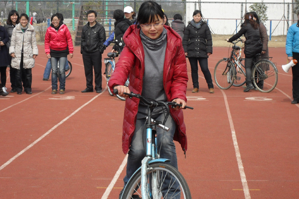 在田径场的百米赛道上,布置了20米长的比赛区域。裁判员一声令下,选手们小心翼翼出发了。自行车慢骑,不许定车,不许压线,比的就是谁更慢。有的选手骑得十分顺利,却不知道自己已经“一骑当前”了;有的选手一心想骑得慢,结果掌握不好车子的平衡,脚着地,反而犯规出局了;还有选手充分总结经验教训,专门把车胎的气放掉,骑着轮胎瘪瘪的自行车,车速似乎是慢了不少。看大家骑着自行车歪歪扭扭地前行,欢笑声时不时响起。比赛中,老师们暂时远离了平日繁忙的工作,得到了实实在在的放松。