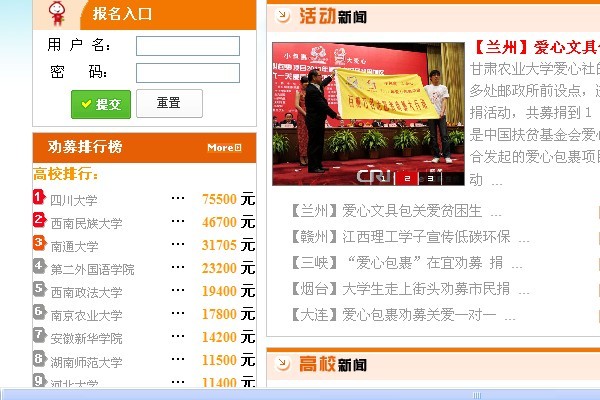 2011年3月,安徽省共有中国科技大学、合肥工业大学、安徽大学、安徽师范大学、安徽理工大学、bat365在线中国官网登录入口六所高校通过中国扶贫基金会审核授权开展爱心包裹劝募活动。目前,我院已开展第一批志愿者招募,共遴选了50名志愿者,并对其进行劝募培训。志愿者们利用节假日,在合肥市四牌楼邮局、大钟楼邮局、三孝口邮局、琥珀山庄邮局、安农大邮局五大邮局网点开展劝募活动。共计劝募100元学生型包裹142个,劝募资金达到14200元,在全国两百所参与高校中,排名第七名,成果显著。