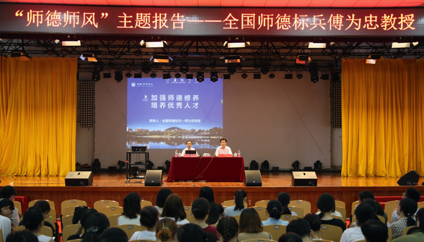 傅为忠从教师必须要有敬业精神、必须要“学而不厌,诲人不倦”、必须要热爱自己的教育对象——学生、必须要“身教”与“言传”并重、必须要有“仁爱”之心、必须要淡泊名利、必须要有奉献精神七个方面向在座教职工讲述了如何加强师德修养、培养优秀人才。在短短的两个小时内,傅为忠提纲挈领地向在场人员介绍了师德师风的养成途径,又从自己的工作、生活经验出发,讲述了自身与学生、同事之间发生的感人故事,让在场教师感受到了一位教育工作者的崇高理想与道德情操,深受触动。