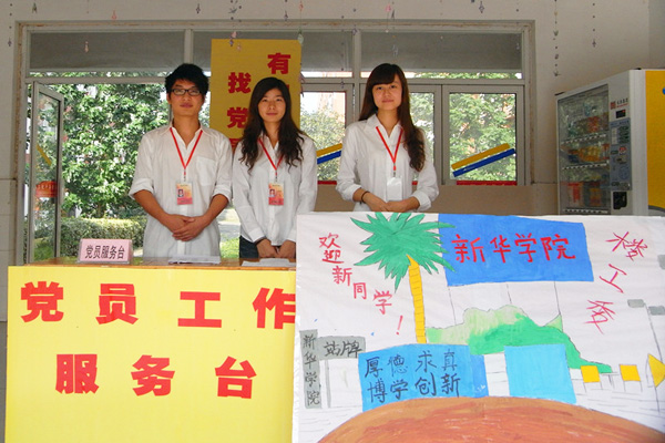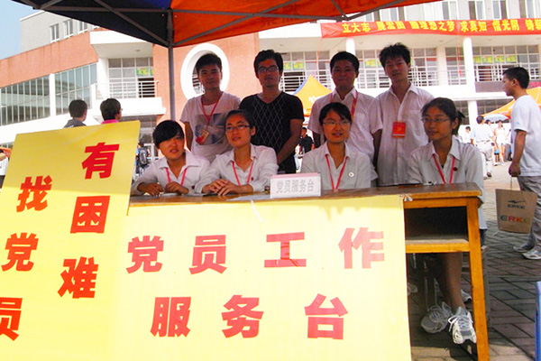 学生党小组在各栋楼和学院中心广场摆设了党员工作服务台并制作了“勇于创新、甘于奉献”、“有困难、找党员”等标语标牌,凸显了本次迎新的工作定位是以最好的精神面貌,在最细微之处做好服务工作,展现学生党员的风采。此次工作的主要任务是做好新生及家长的接待及分流工作,开展党员咨询服务。党员们面带笑容,热心、细致地回答各种问题,带着他们到报到点办理入学手续。
