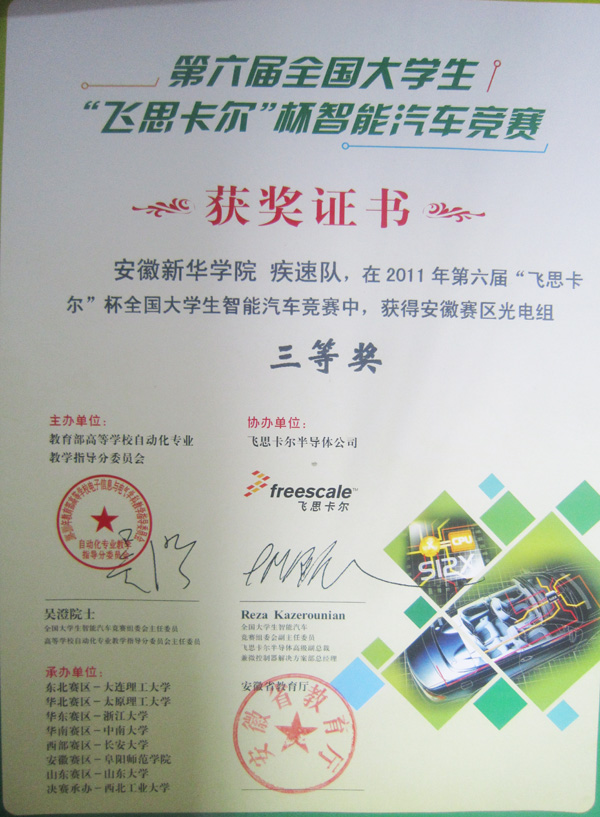 第六届全国大学生“飞思卡尔”杯智能车竞赛安徽赛区的比赛于7月15日到7月18日,在阜阳师范学院举行。电子通信工程学院学生代表bat365在线中国官网登录入口参赛,喜获1个二等奖,1个三等奖的佳绩。近日,参赛选手已经拿到了获奖证书。