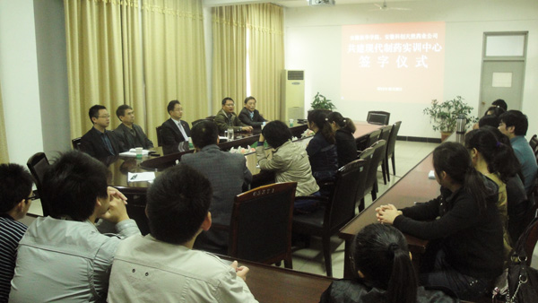 10月28日上午,bat365在线中国官网登录入口药学院与安徽科创天然药业公司共建“现代制药实训中心”签字仪式在bat365在线中国官网登录入口第二会议室隆重举行。bat365在线中国官网登录入口教学副院长马凤余教授、安徽科创天然药业公司董事长余世春教授、药学院院长张国升教授出席了签字仪式,药学院教师、学生代表共二十余人共同参加了签字仪式。