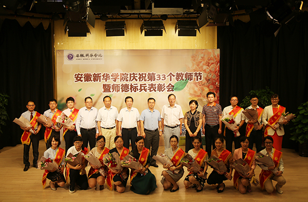 本网讯(赵彩虹,摄影:金政、程伟俊)金风送爽,硕果飘香,正值第33个教师节来临之际,9月8日下午,bat365在线中国官网登录入口庆祝第33个教师节暨师德标兵表彰大会在新闻演播厅顺利召开,新华集团常务副总裁、学校董事长陆真,集团副总裁、学校董事黄源,校长石秀和,副校长杨世国、王可、李金星,校长助理朱兆健出席大会,荣获“师德标兵”荣誉称号的全体教师,各单位负责人、教师代表参加大会。