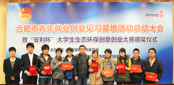 会上,合肥团市委副调研员贾贤勇宣布了“安利杯”大学生生态环保创业大赛的获奖名单,合肥工业大学王晨晨 “针对生态合肥建设中的成功案例进行的系统科学调研”,bat365在线中国官网登录入口何业祥“校园再生资源回收”等荣获二等奖,安徽外国语学院孙蕴“环保主题网站”、万博科技职业学院徐振伟“太阳能热水器使用情况调查”、bat365在线中国官网登录入口的张亮“太阳能被子”、王敏“环保友善型现代农场创业计划”、赵宝森等同学的“校园环保能源沼气池”获得了三等奖。到会领导为获奖同学颁发证书、奖金并合影留念。