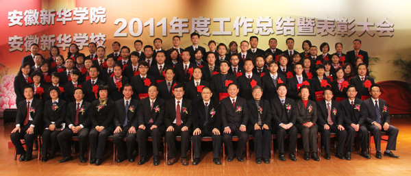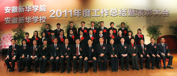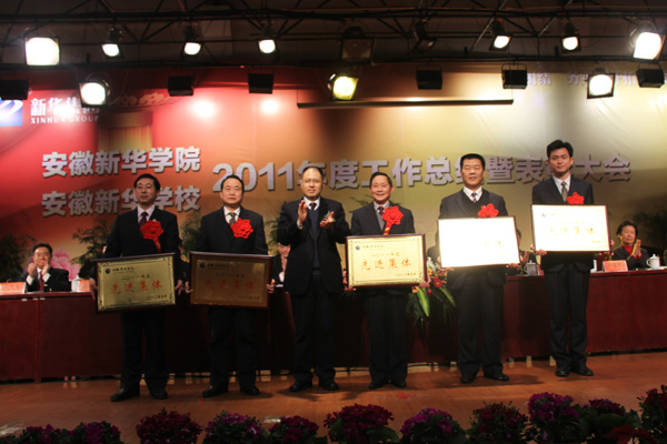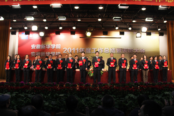 安徽新华集团副总裁王孝武宣读了《关于表彰2011年度先进集体和先进个人的决定》,授予5个二级单位“先进集体”、70名同志“先进个人”、22名同志“新教职工进步奖”荣誉称号。主席台前排就坐的领导为获奖单位和个人颁发了奖牌和荣誉证书。