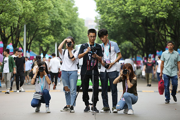 和大学生记者团一起活跃在迎新现场的,还有这样一群身影,他们手执相机,拍摄下华园里点点滴滴的感动,他们就是摄影工作室的小伙伴们。迎新前,记者团和摄影工作室开了迎新专题会议,记者团撰写稿件,摄影工作室负责配合采集照片。在此之前,暑假里还为部门新生做了摄影培训课的课件。