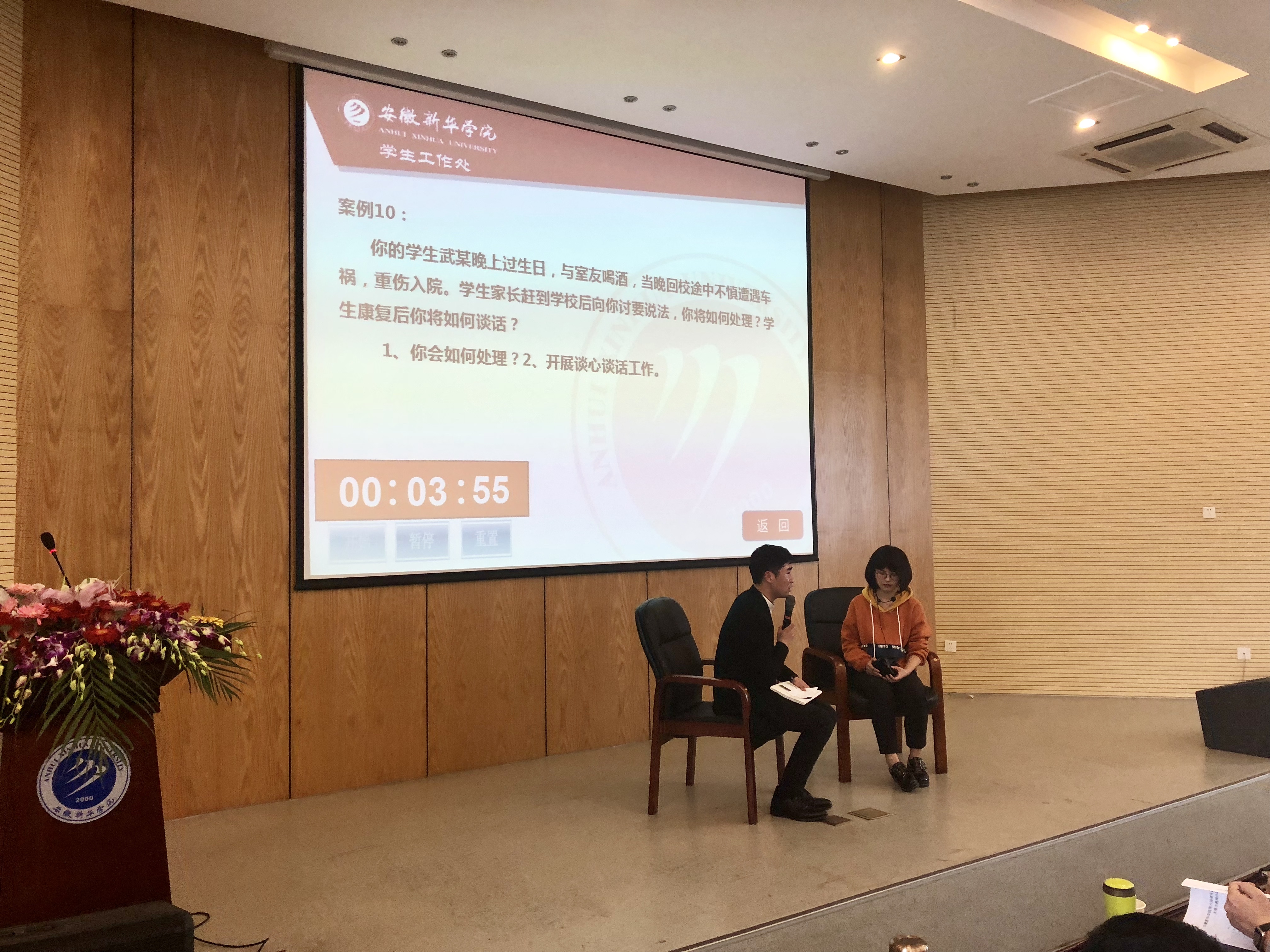 在“班情熟知”环节中,参赛辅导员对随机抽取的学生基本信息了如指掌、对答如流。“案例分析和谈心谈话”环节主要考察选手们综合运用各项法律、法规和教育学、心理学、生涯规划、事务管理等辅导员工作技能,对现实工作中发生的具体案例进行分析、解决的能力。他们面对学生演员故意“刁难”的情景模拟,耐心交流,悉心引导,体现出辅导员们的工作能力和工作水平。
