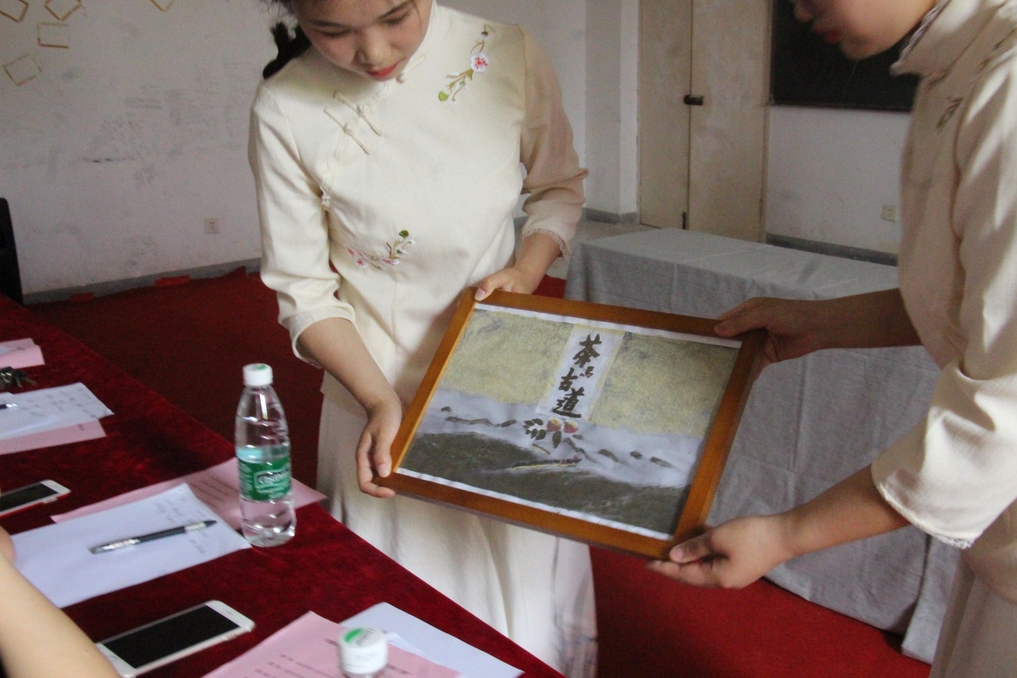 大赛共分为两个环节,茶艺表演和茶文化创新作品展示。在茶艺表演环节中,来自三个不同院系的“诗茶雪”队,“茶忆”队以及“蜀山茶客”队分别表演了《绿雪茶道》《忆往昔》和《缅怀先烈,珍爱和平》的主题茶艺。现场曲调优雅和谐,选手们有条不紊,给大家带来了一场视听盛宴。“诗茶雪”团队将茶艺表演与古诗结合,给人古朴典雅的视觉感受;“茶忆”队以纪念新民学会成立背景为主线,结合古筝演奏,用茶艺表演表达对毛主席的敬意,展现时代精神。“蜀山茶客”团队以古典祭祀为主线,结合茶礼的茶艺表演,表达对为中国抗战而牺牲的先烈的缅怀,现场动作娴熟,主题鲜明,表达了大学生的 爱国精神和对和平的向往。对在茶文化创新作品展示中,“诗茶雪”队的《茶诗书法》,“茶忆”队的《茶忆中国》,以及“蜀山茶客”的《茶马古道》等都备受评委好评。经过评委们认真研究决定推荐“蜀山茶客”队参加省赛。