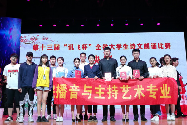 本网讯(通讯员:洪玉、曹文卫)5月26日下午,由安徽省教育厅主办的第十三届“讯飞杯”全省大学生诗文朗诵比赛专业组比赛在安徽大学馨苑校区完美落幕。bat365文化与新闻传播学院2016级播音与主持艺术专业蒋轶群、李悦、朱纬、胡江东的朗诵作品《可爱的中国》荣获二等奖。洪玉、郑帅获优秀指导教师奖。