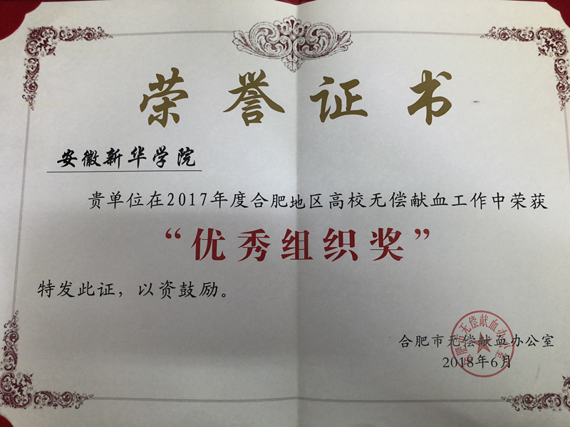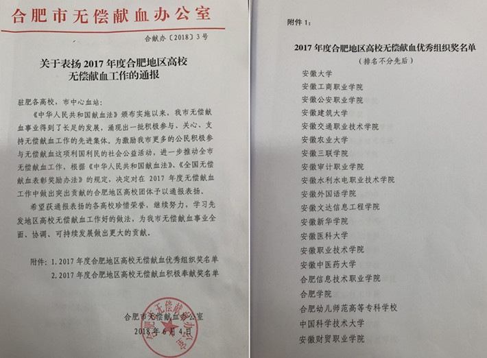 本网讯(通讯员:邢长露)日前,合肥市无偿献血办公室发布《关于表彰2017年度合肥地区高校无偿献血工作的通报》,对获得2017年度合肥地区高校无偿献血单位进行了表彰,bat365荣获“优秀组织奖”。