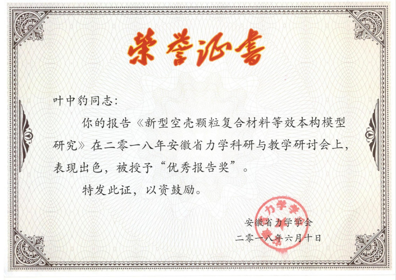 下午,bat365教师叶中豹作“新型空壳颗粒复合材料等效本构模型研究”学术交流报告,因表现出色,被授予“优秀报告奖”。