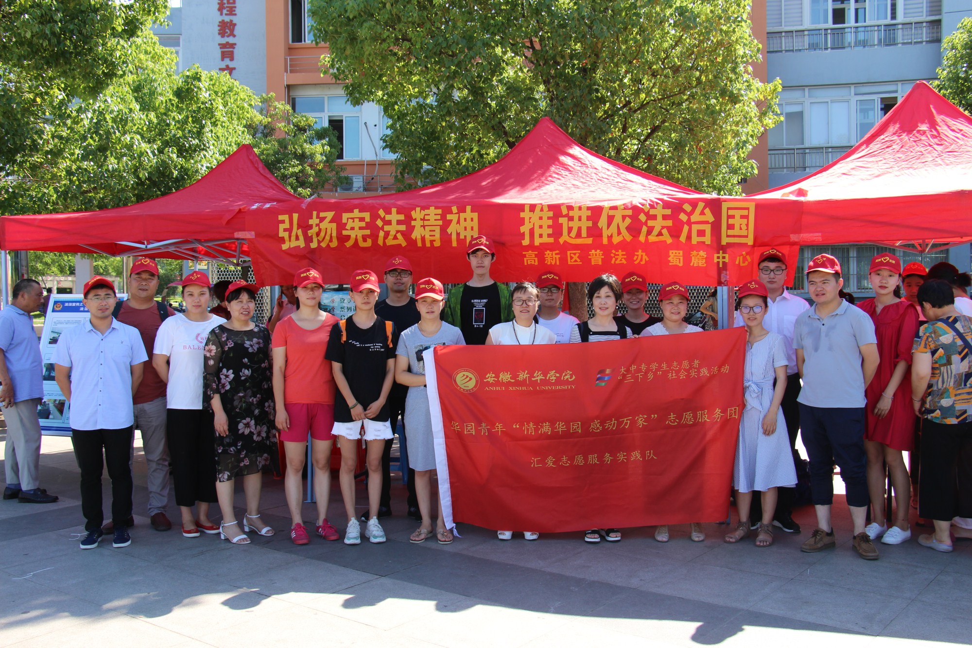 6月26日上午,华园青年“情满华园 爱传万家”志愿服务团之药学院汇爱志愿社会实践队与高新区志愿者们在蜀南庭苑志愿服务广场一同开展了“弘扬宪法精神,推进依法治国”为主题的法律咨询会。