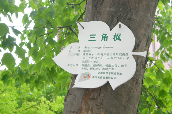 5月11日上午,总务处开始对校园内首批27种树木挂牌。各树牌上显示了该植物的学名、科目、生态习性、形态特征等内容。挂牌树木有银杏、香樟、桂花、广玉兰等名贵树种,也有国槐、合欢、法梧、青桐等数目多或树龄大的树种。