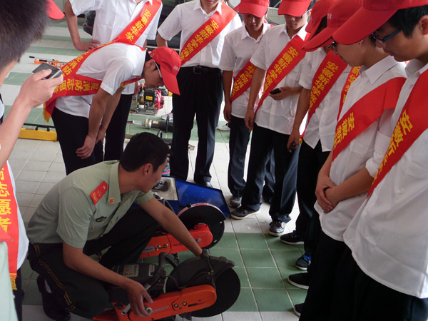 消防大队官兵首先带领志愿者参观了消防器材装备库,详细介绍了相关灭火、救援器材和装备的作用、使用范围及方法,并对部分装备进行了现场展示。随后,消防志愿者们亲身体验了对部分装备器材的使用,如消防战斗服、空气呼吸器、切割机等。志愿者们纷纷感觉背在身上的装备很重,但感觉更重的还是责任。